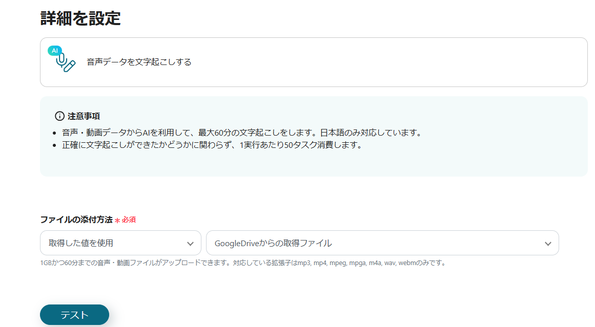 A:文字起こし機能のアクションは、最大30分(25タスク)・60分(50タスク)・90分(75タスク)の3種類あります。音声の長さに合わせて選択しましょう。それぞれ消費するタスク数が異なりますのでご注意ください。