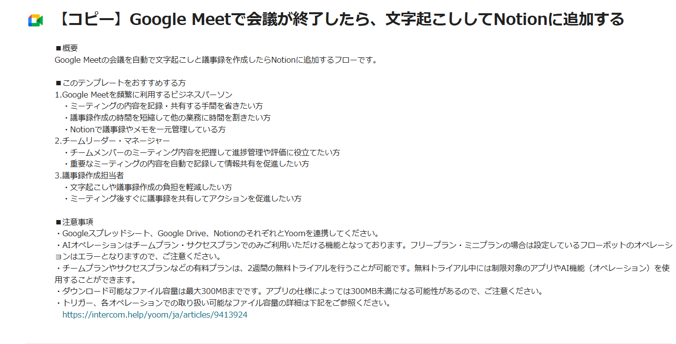 このテンプレートは、Google Meetの会議を自動で文字起こしし、議事録をNotionに追加する仕組みです。
