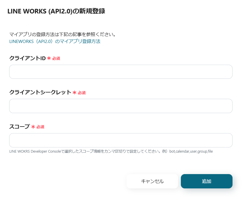 LINE WORKSのマイアプリ登録は「クライアント ID」と「クライアントシークレット」に事前準備で取得した値を入力します。