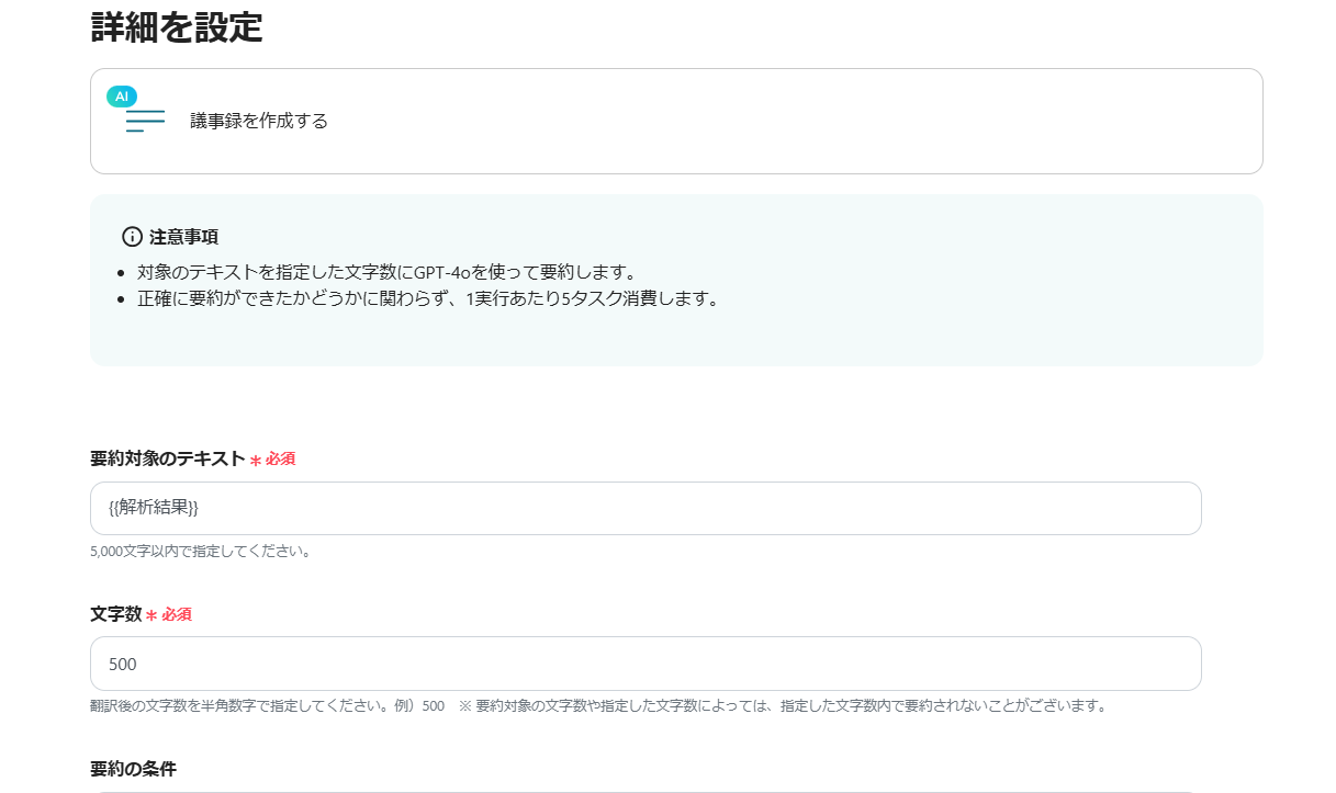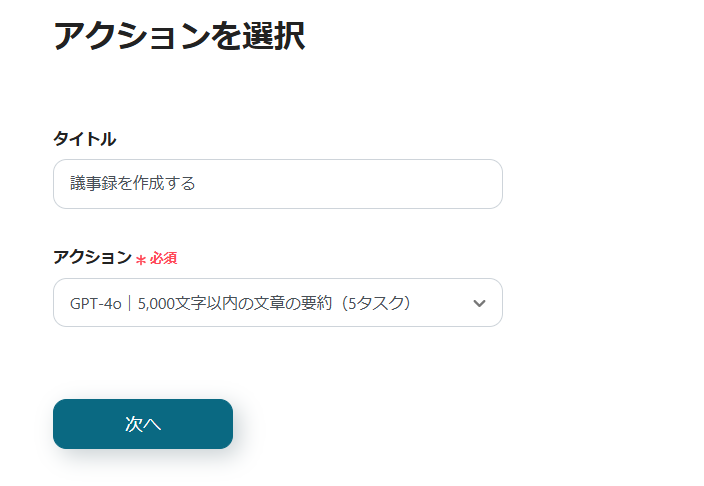 2) アクションは「5,000文字いないの文章要約(5タスク)」を選択し、「次へ」をクリックします。