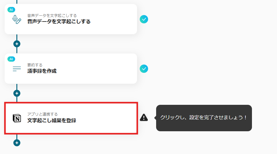 1) フローに戻り、「アプリと連携する 文字起こし結果を登録する」のアイコンをクリックします。