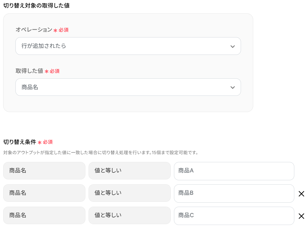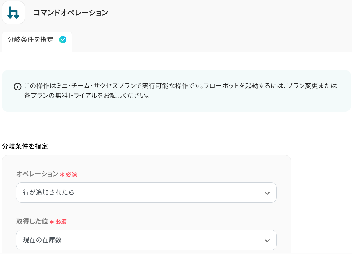 ・分岐はミニプラン以上のプランでご利用いただける機能(オペレーション)となっております。フリープランの場合は設定しているフローボットのオペレーションはエラーとなりますので、ご注意ください。