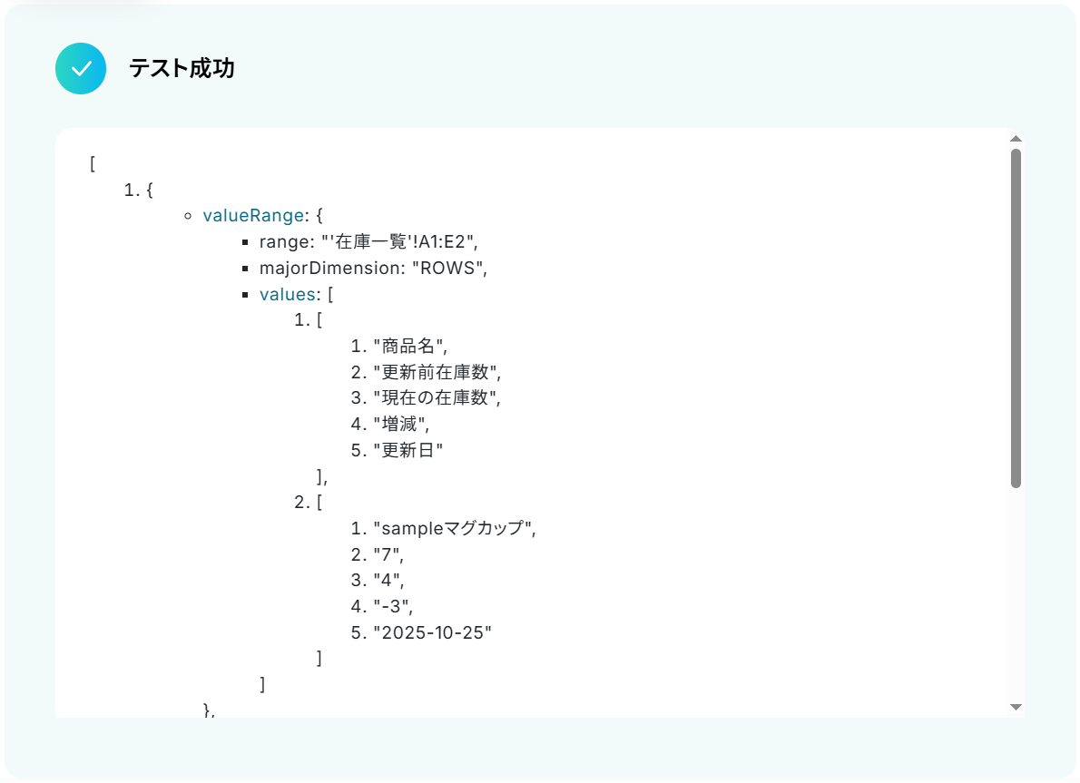 成功すると取得した値にGoogle スプレッドシートのデータが表示されます。確認後、保存しましょう。