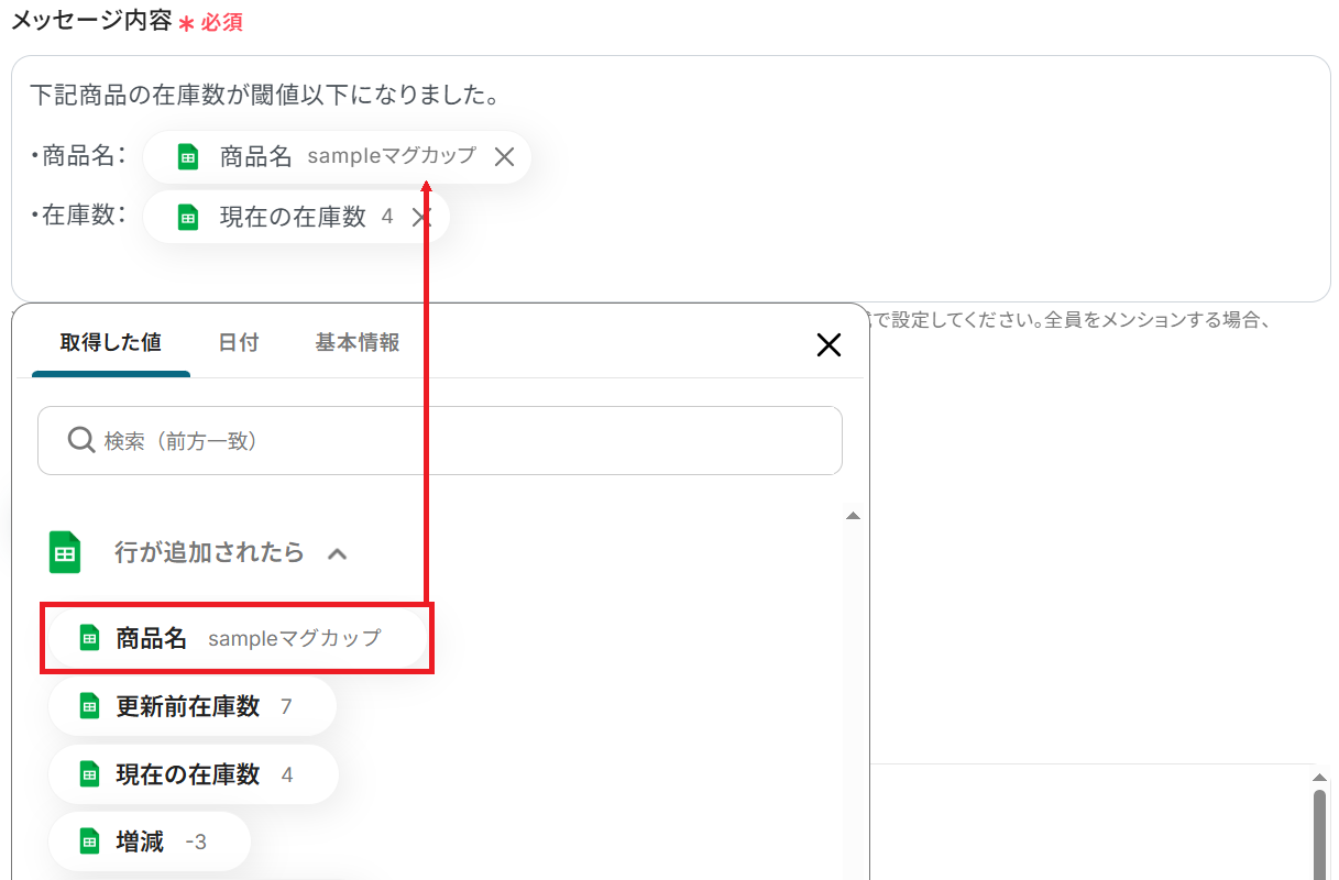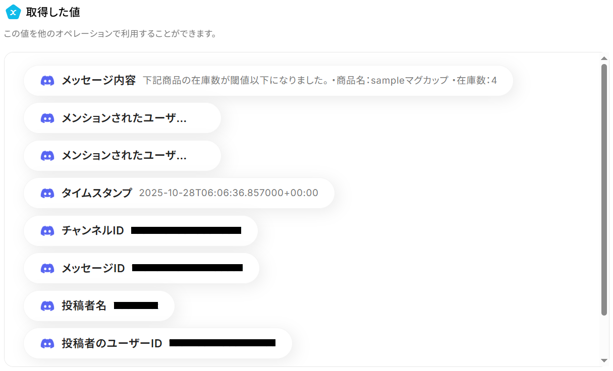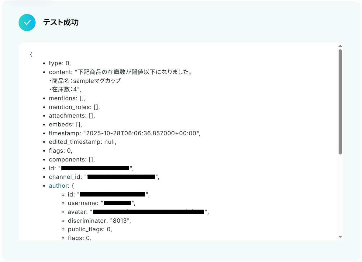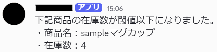 該当商品の在庫数が先ほど設定した数より少ない旨を、Discordで通知します。