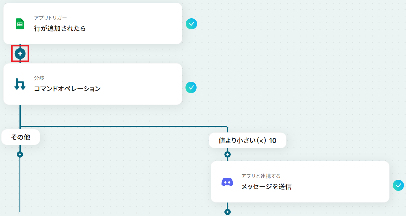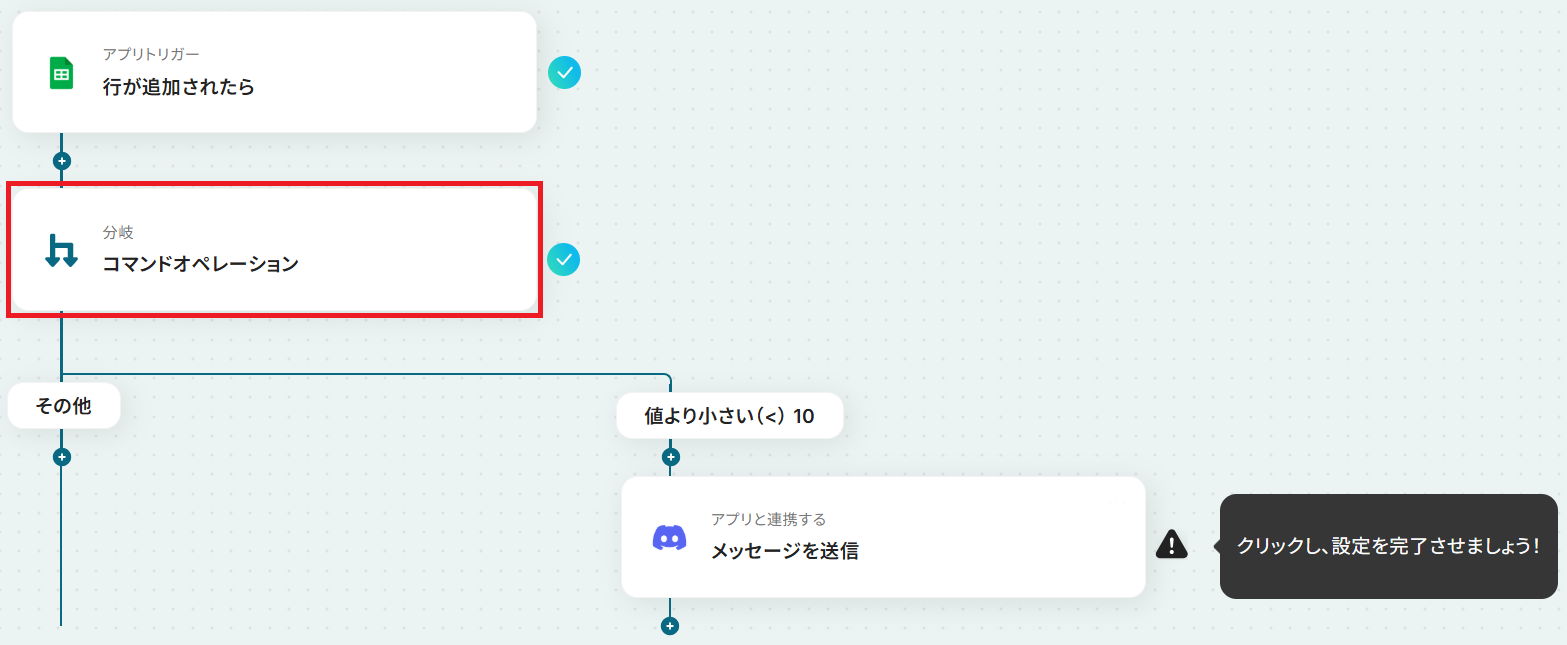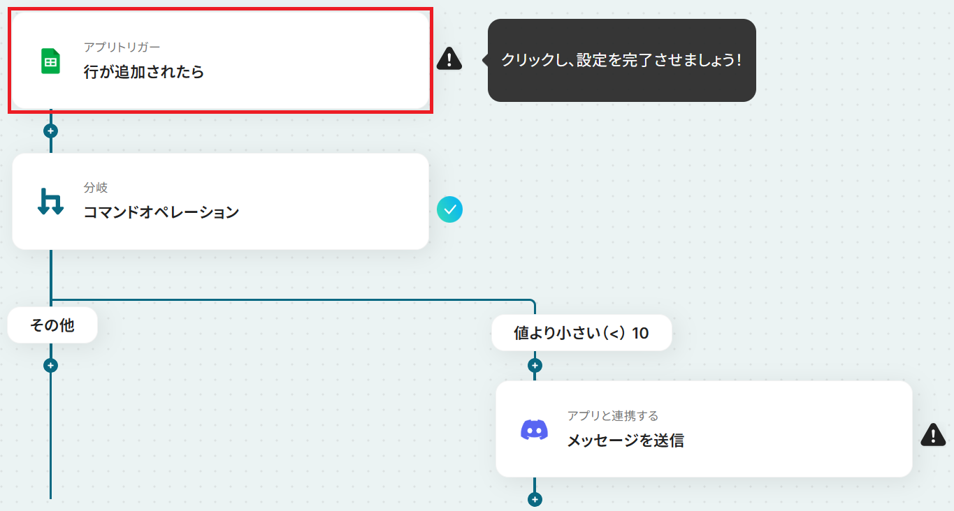 - Google スプレッドシートのトリガー設定、分岐設定、Discordのアクション設定