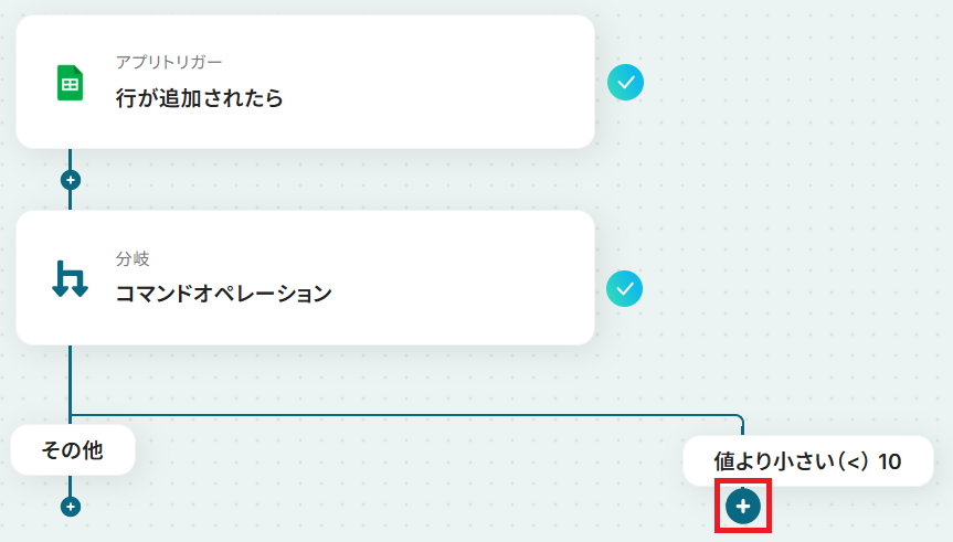 今回は、取得した値(現在の在庫数)が特定の数字(例として「10」)より小さい場合に次のステップに進むよう設定しています。