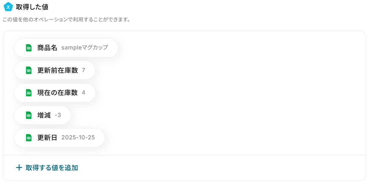 オペレーションは「行が追加されたら」、取得した値は「現在の在庫数」のままで大丈夫です。