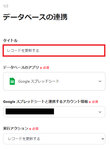 2. 連携アカウントとアクションを選択します。・タイトル:必要に応じて変更してください。・「データベースの連携」の各項目:欄下部の注記を参考に入力・選択してください。