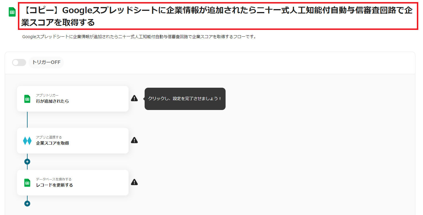テンプレートを使って「Google スプレッドシートに企業情報が追加されたら二十一式人工知能付自動与信審査回路で企業スコアを取得する 」業務フローの作成手順をご紹介します。