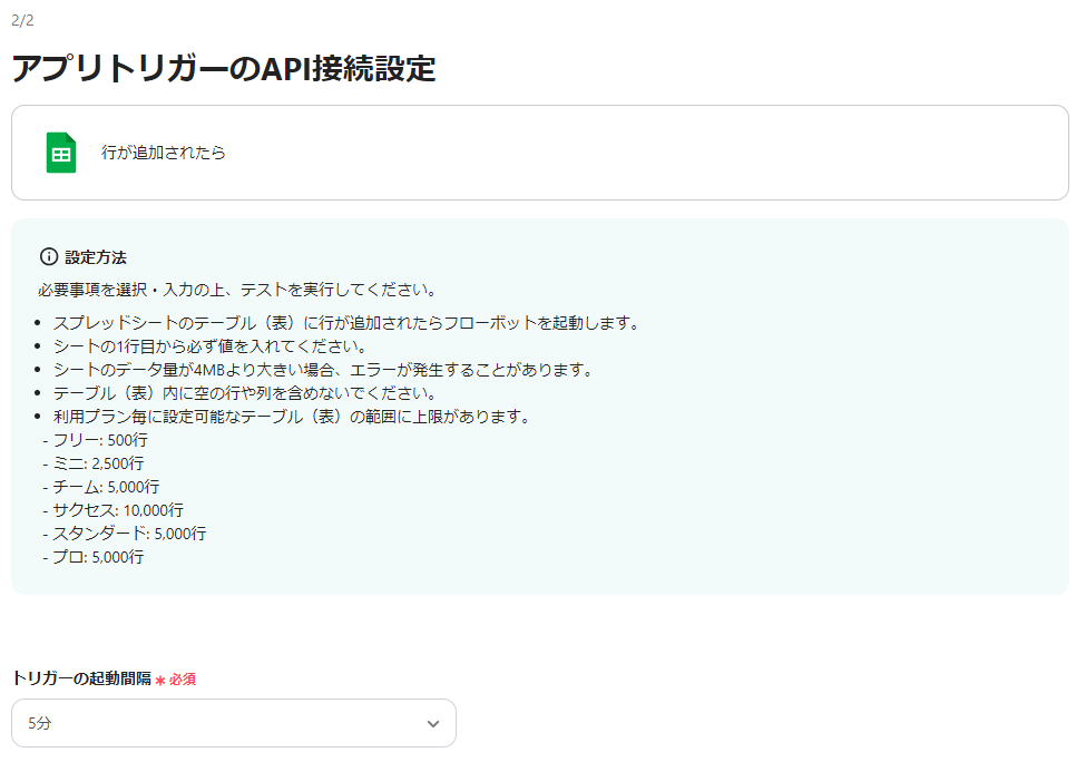 4. アプリトリガーのAPI接続設定を行います。欄下の注記を参考に、各項目の入力・選択を行ってください。※起動間隔はプランごとに指定できる時間が異なります。参考:各プランの機能制限や使用上限の一覧 ※下図は入力例です。