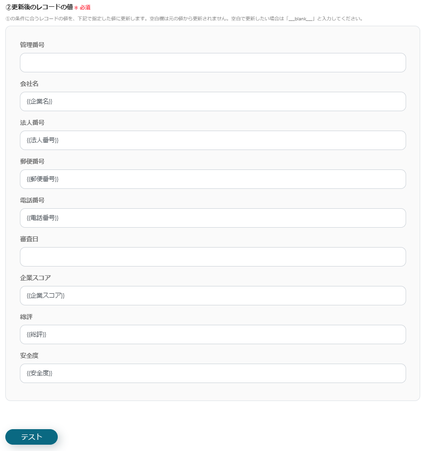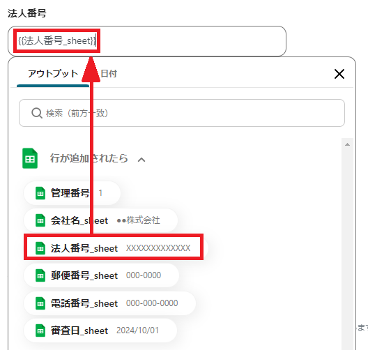 3. API接続設定を行います。各欄下部の注記を参考に、ステップ2で取得したアウトプットを参照してください。※下図は入力例です。法人番号の有無にかかわらず取得するため、すべての項目にGoogle スプレッドシートの記載情報を参照するよう設定しています。