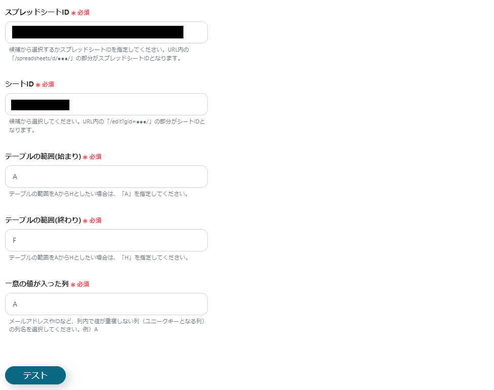 Google スプレッドシートのトリガー設定では、連携の対象としたいスプレッドシートIDやシート名を任意で設定してください。 二十一式人工知能付自動与信審査回路に審査を依頼する際、スプレッドシートから取得したどの列の情報をどの項目に連携するかを自由に設定可能です。 ■注意事項