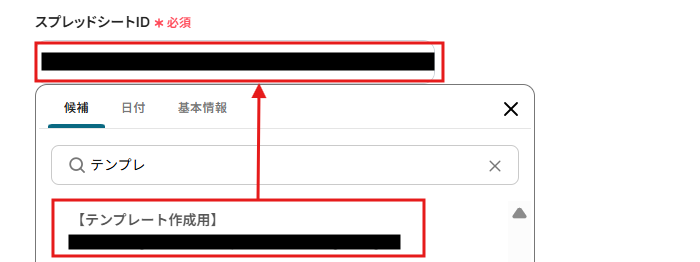 スプレッドシートIDは候補から選択してください。 指定したいGoogle スプレッドシートを選ぶイメージです。