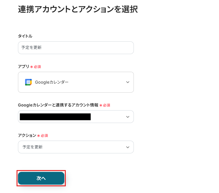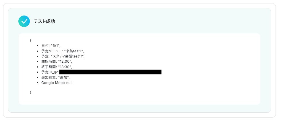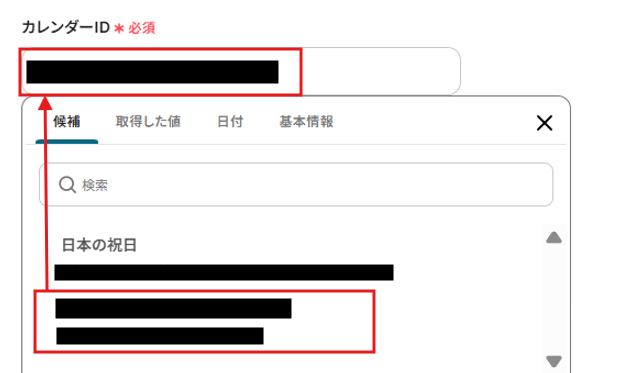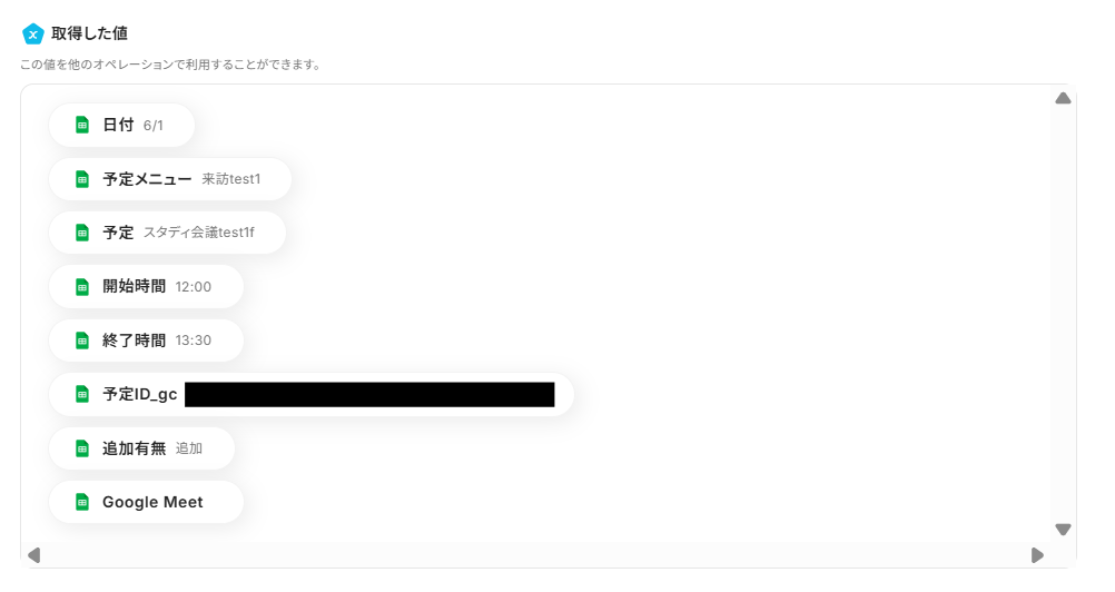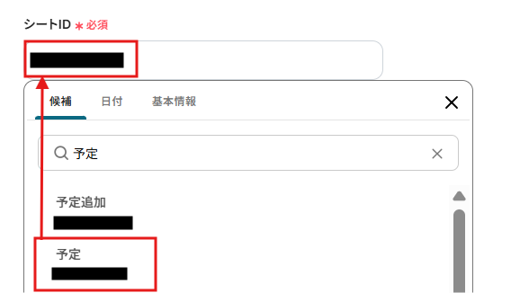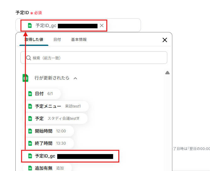 次に予定IDを取得した値から選択してください。 Google スプレッドシートから取得した値です。