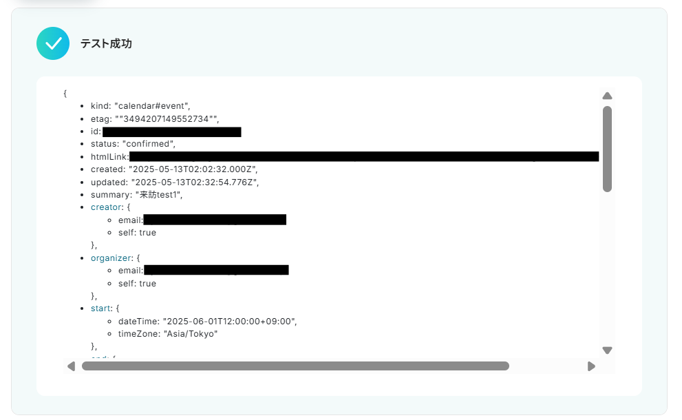 テスト成功後、元々登録されていたスケジュールが更新されているか確認しましょう。 10時からだった予定が12時からに更新されていますね。
