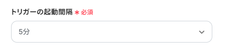 プルダウンから設定可能です。 トリガーの起動間隔は、5分、10分、15分、30分、60分のいずれかで設定可能です。 今回は5分で設定しました! 基本的にはそのプラン の最短の起動間隔に設定するのがおすすめです。ご利用プラン によって、設定できるトリガーの最短間隔が違うので、その点は要チェックです!