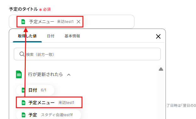 予定のタイトルは、取得した値から「予定メニュー」を選択しましょう。 使用しているシートの予定のタイトルに当てはまるものを選んでください。