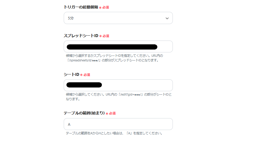 スプレッドシートID、シートIDは入力欄をクリックすると候補が表示されるので、その中から選択してください。