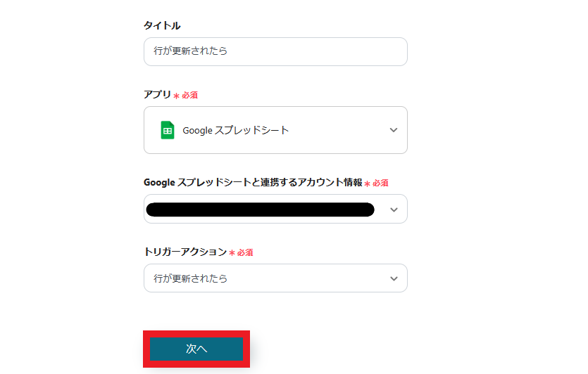 Google スプレッドシートと連携するアカウント情報を入力します。