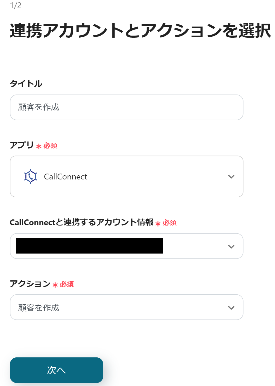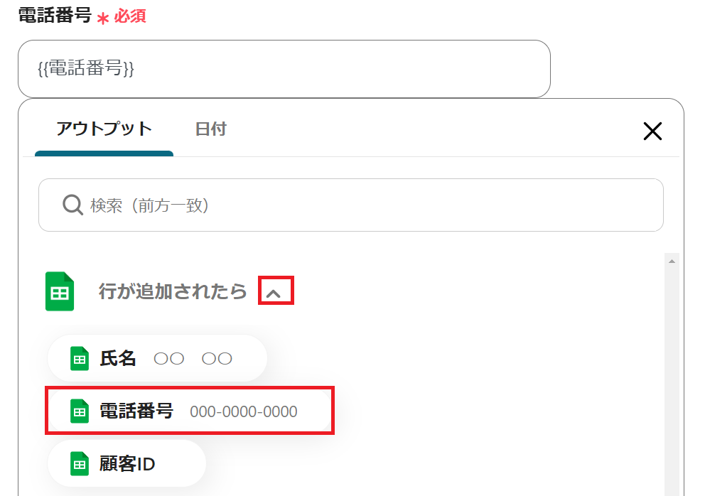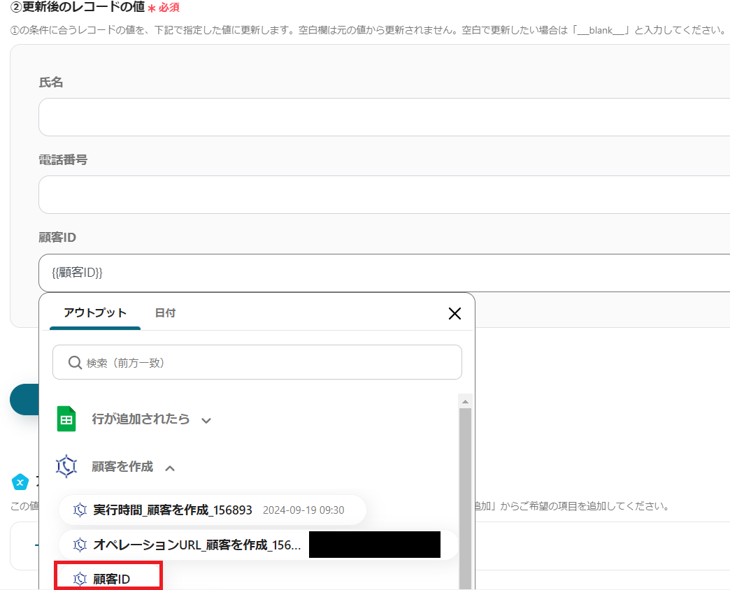 CallConnectから取得した顧客IDを更新するので、「顧客ID」にCallConnectのアウトプットを使用します。