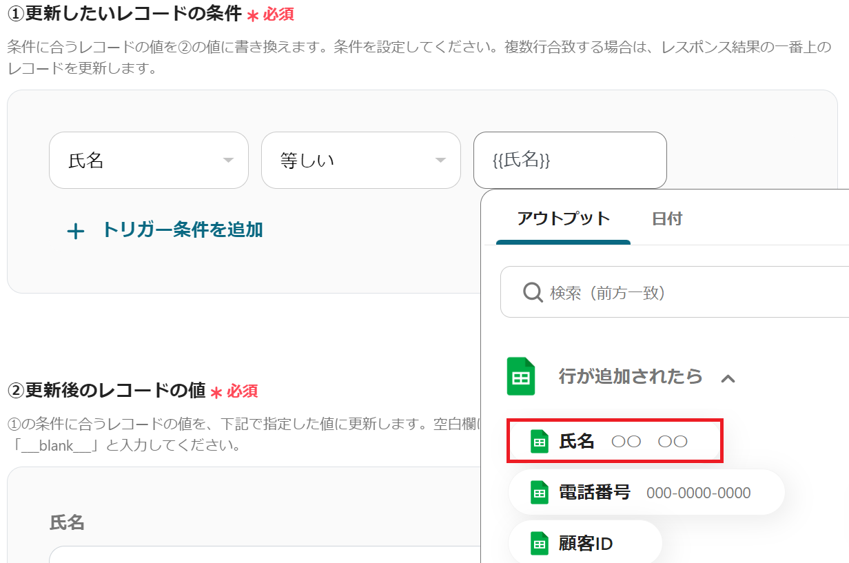スクロールし、「更新したいレコードの条件」を設定してください。