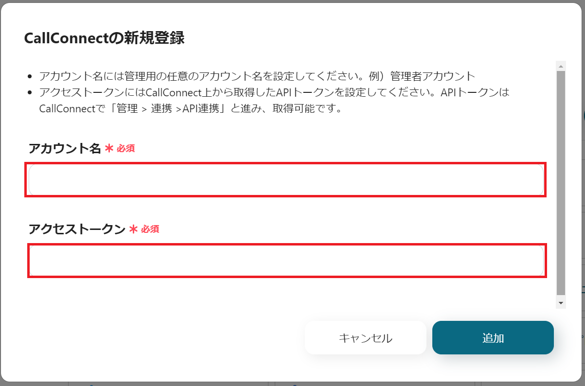 以下の画面が表示されるので、説明文を確認し、「アカウント名」と「アクセストークン」を入力します。