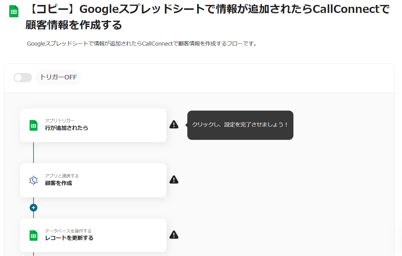 今回は、「Googleスプレッドシートで情報が追加されたらCallConnectで顧客情報を作成する」以下のテンプレートの設定方法をご紹介します。