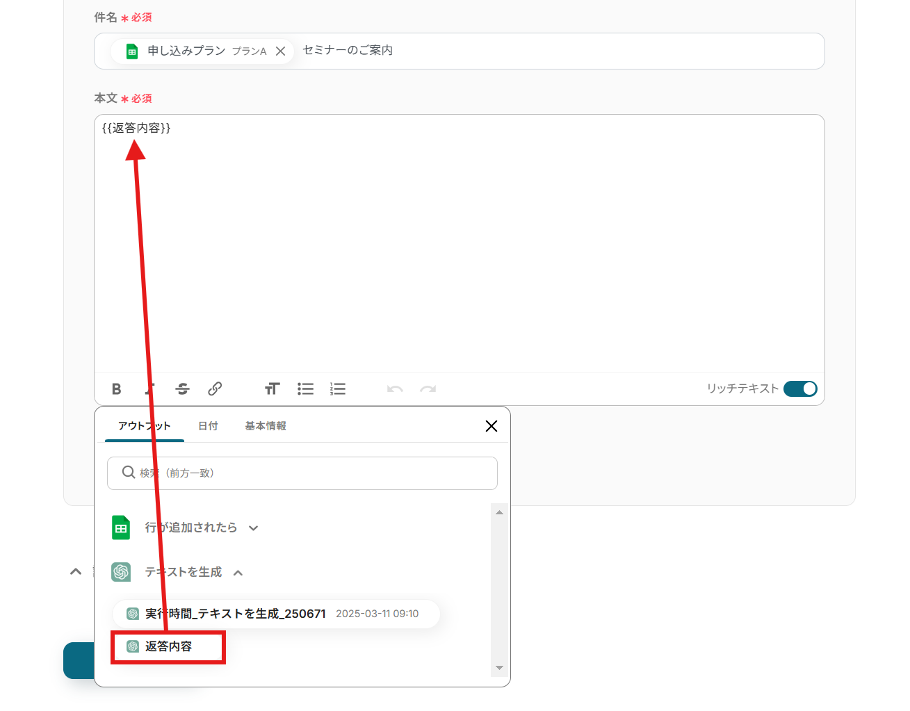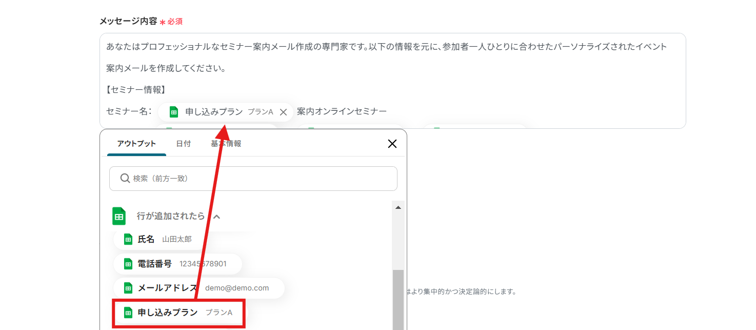 ここに固定のテキストを入れてしまうと、毎回それについて生成されてしまうため、氏名や電話番号などの変動する値はアウトプットから必ず選択してください。
