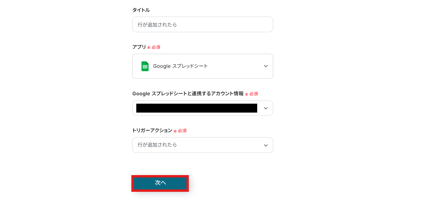 トリガーは「行が追加されたら」を選択します。設定が終わったら「次へ」をクリックします。
