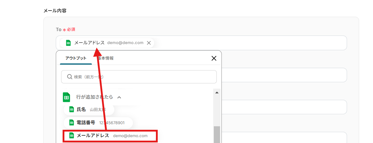 入力欄をクリックすると以下の画面のようにGoogle スプレッドシートから取得した情報を引用できます。