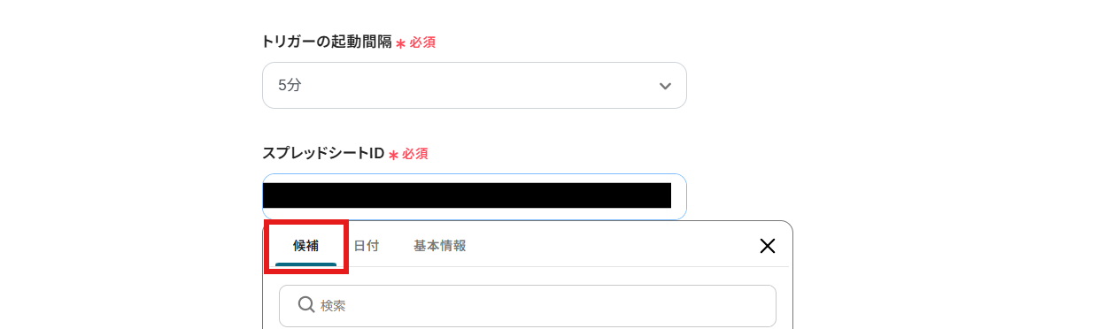 ・スプレッドシートID:欄をクリックし、候補から事前に用意したスプレッドシートを選択します。