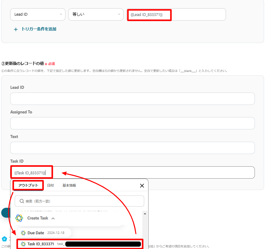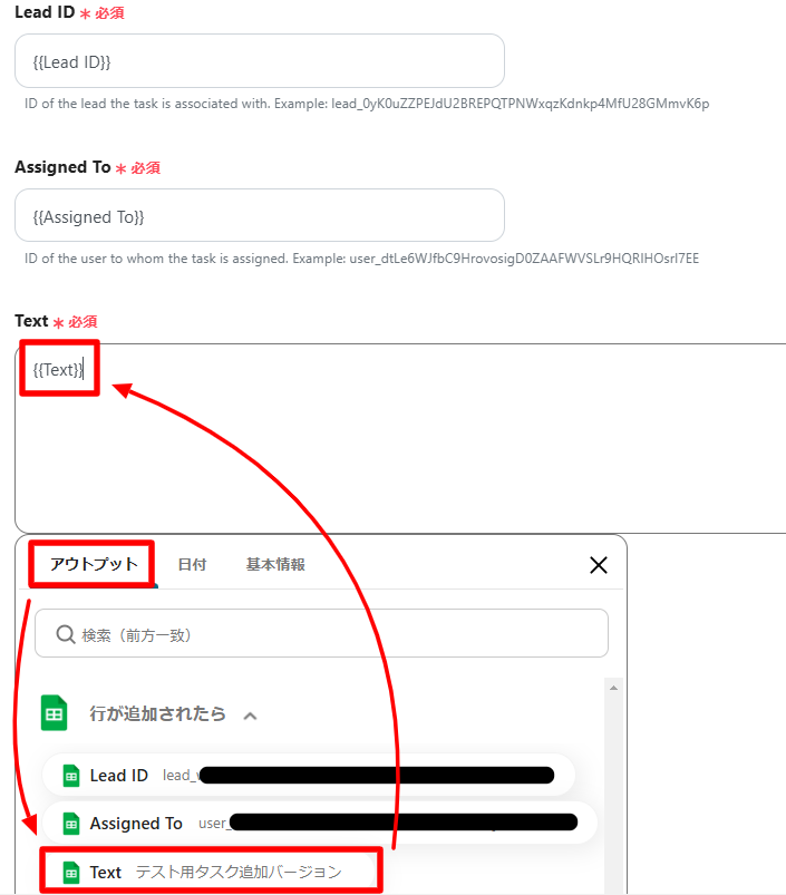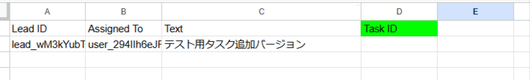 上記画像ではGoogle スプレッドシートに入力されているLead IDがアウトプットで取得したLead IDと等しくなる行に、Task IDを追加(更新)するようになっています。