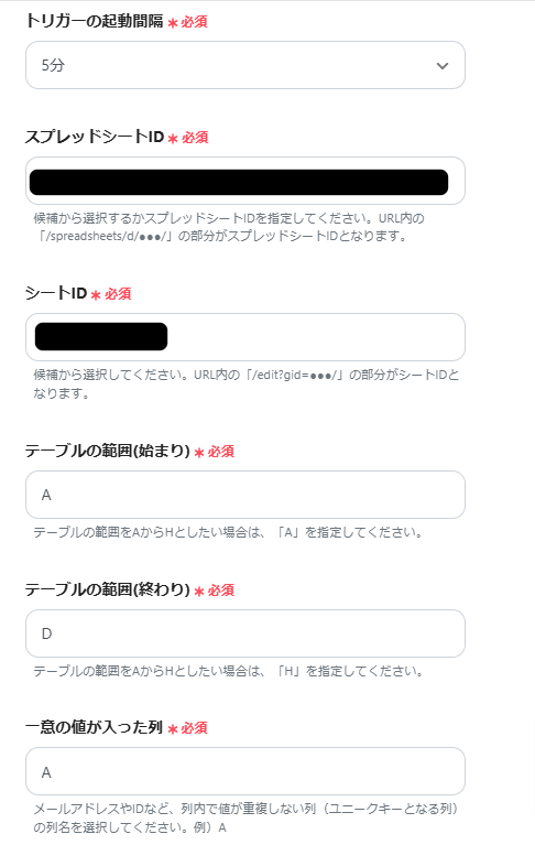「スプレッドシートID」:使用するGoogle スプレッドシート名を候補から選択