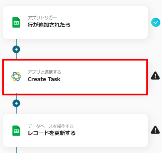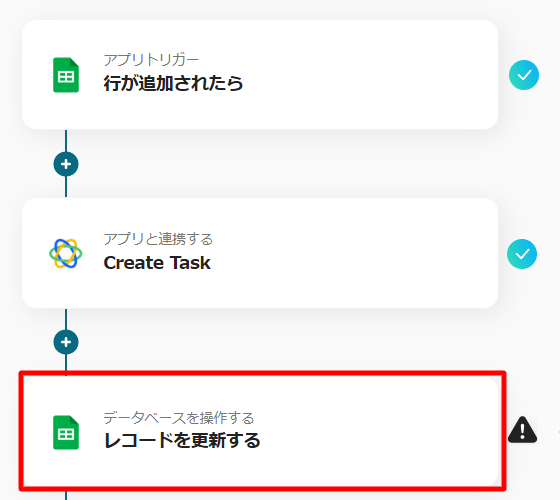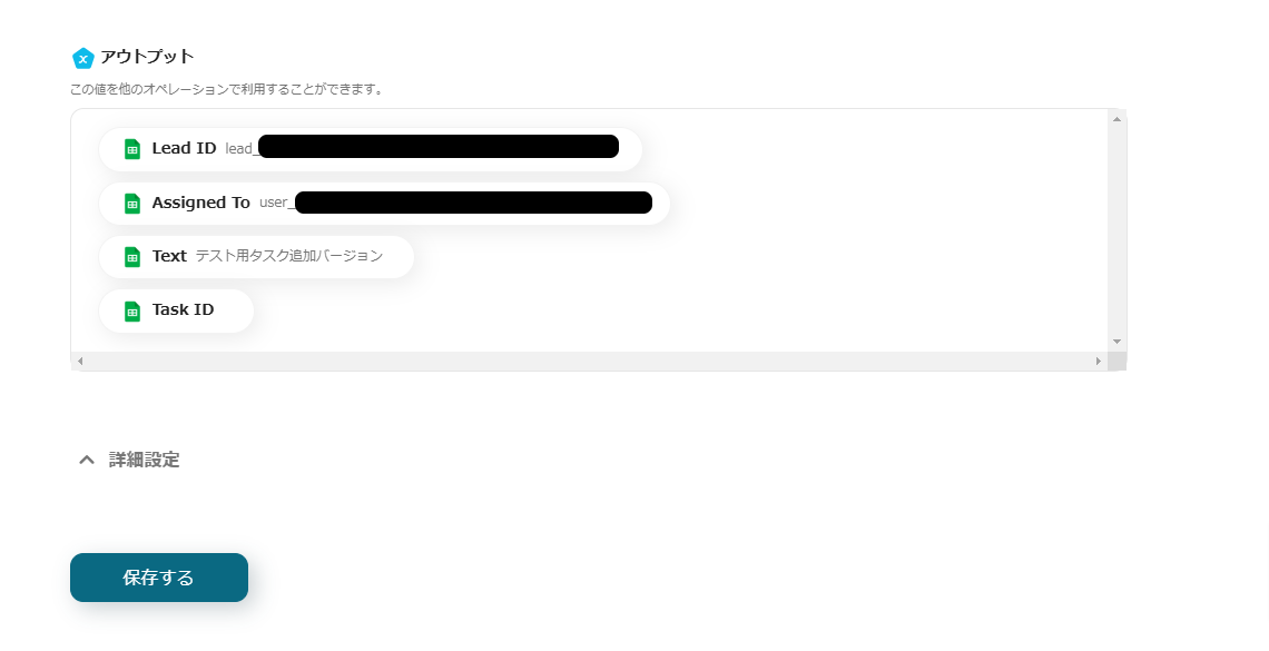 この設定は、今回の設定の対になるCloseのタスクを更新するフローのために必要なもので、Closeの設定で取得したTask IDの情報をGoogle スプレッドシートに反映させるためのものです。