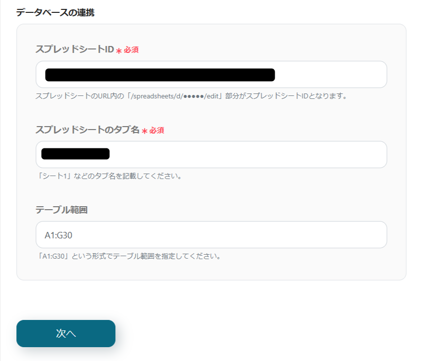 「データベースの連携」に情報を更新するGoogle スプレッドシートの情報を入力します。