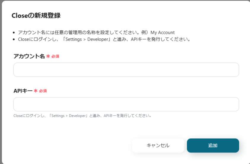 次に、Closeに情報を反映させるための設定を行います。