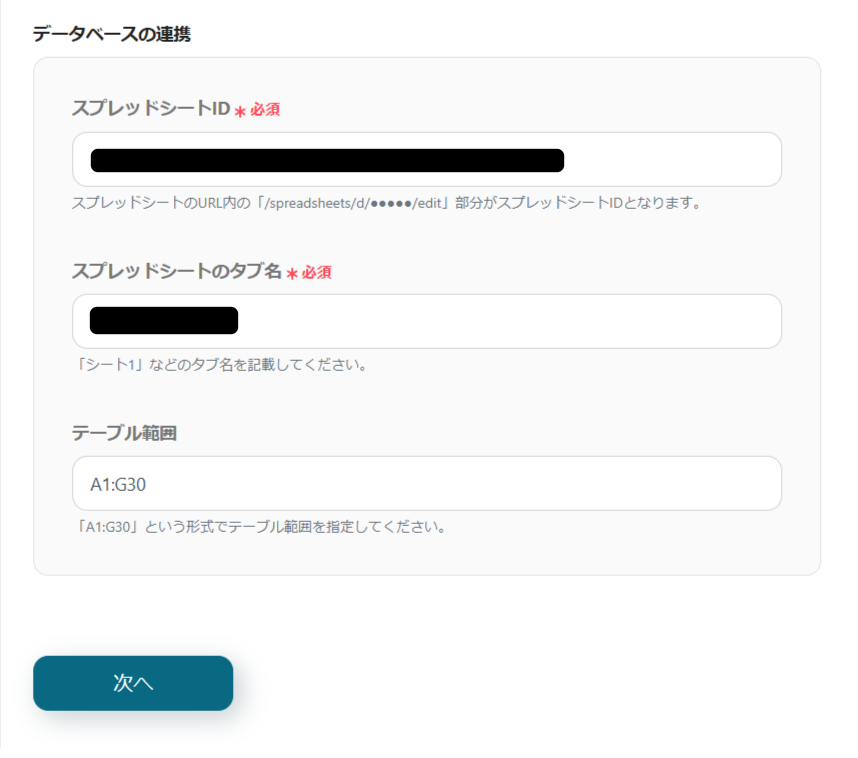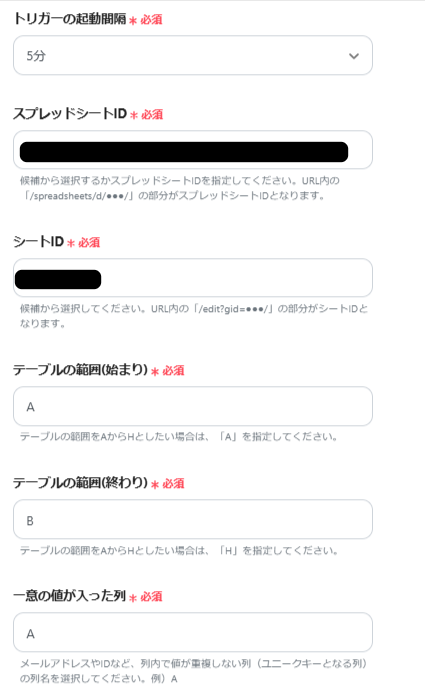 スプレッドシートIDとシートID(タブ名)を候補から選択し、一意の値が入った列まで入力をしてください。