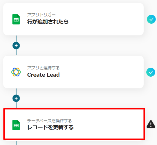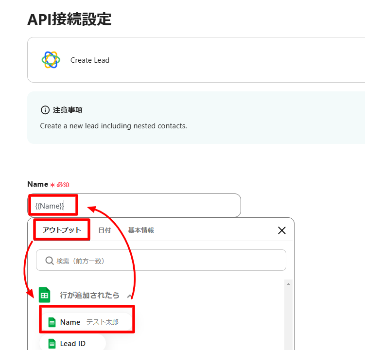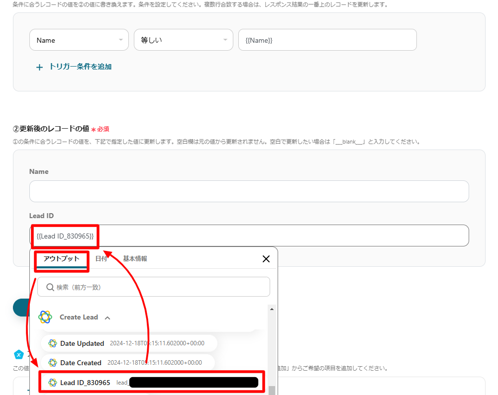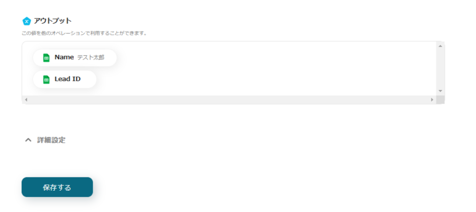 上記では①(Google スプレッドシートのName欄がアウトプットで取得したNameの項目と同じ)の条件で②(Lead IDのアウトプットの値をGoogle スプレッドシートのLead IDの欄に反映させる)を指示しています。