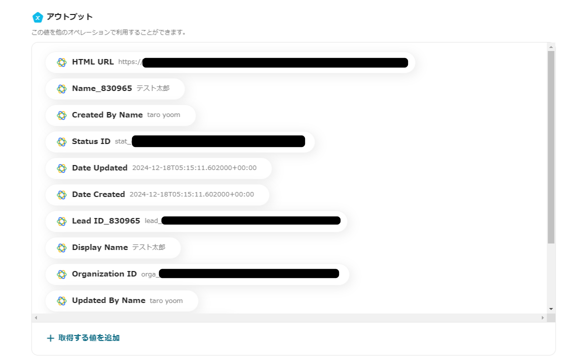 「テスト成功」と表示されると、Closeに新しくリード情報が登録されYoomでは上記のようにアウトプットが取得できます。
