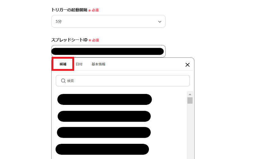 スプレッドシートID、シートIDは入力欄をクリックすると候補が表示されるので、その中から選択してください。