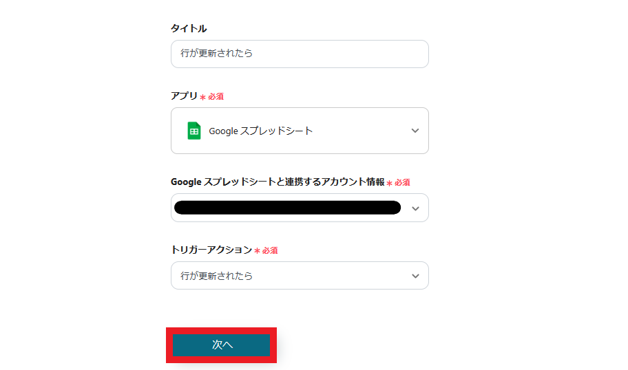 Google スプレッドシートと連携するアカウント情報を入力します。