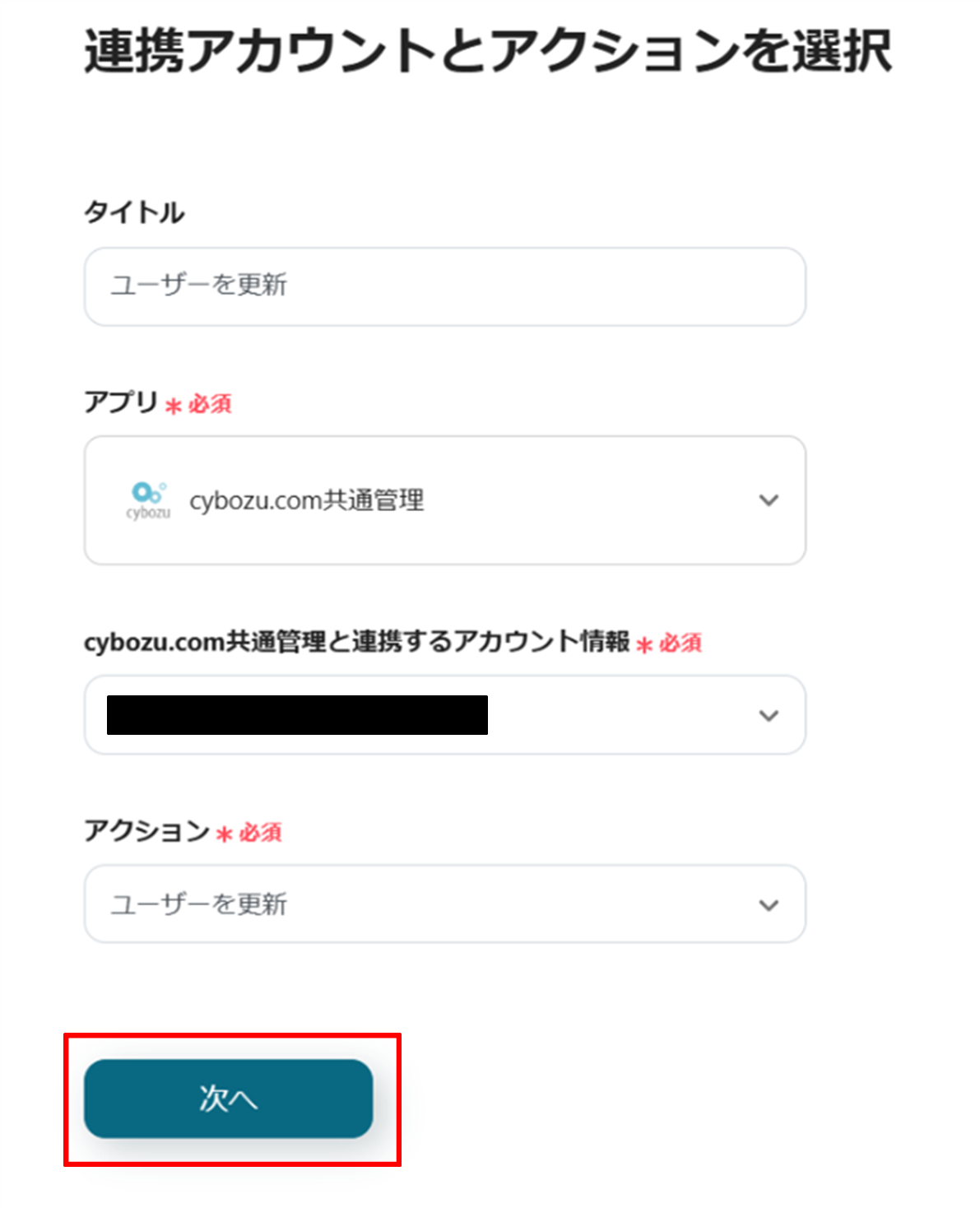 (2)cybozu.com共通管理の連携アカウントとアクションを選択画面からcybozu.com共通管理に連携するアカウント情報を確認し、アクションは「ユーザーを更新」のままで「次へ」をクリックします。