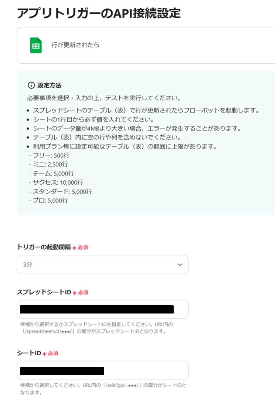 (3)アプリトリガーのAPI接続設定で、トリガーの起動間隔をプルダウンから選択し、スプレッドシートIDとシートIDを候補から選びます。