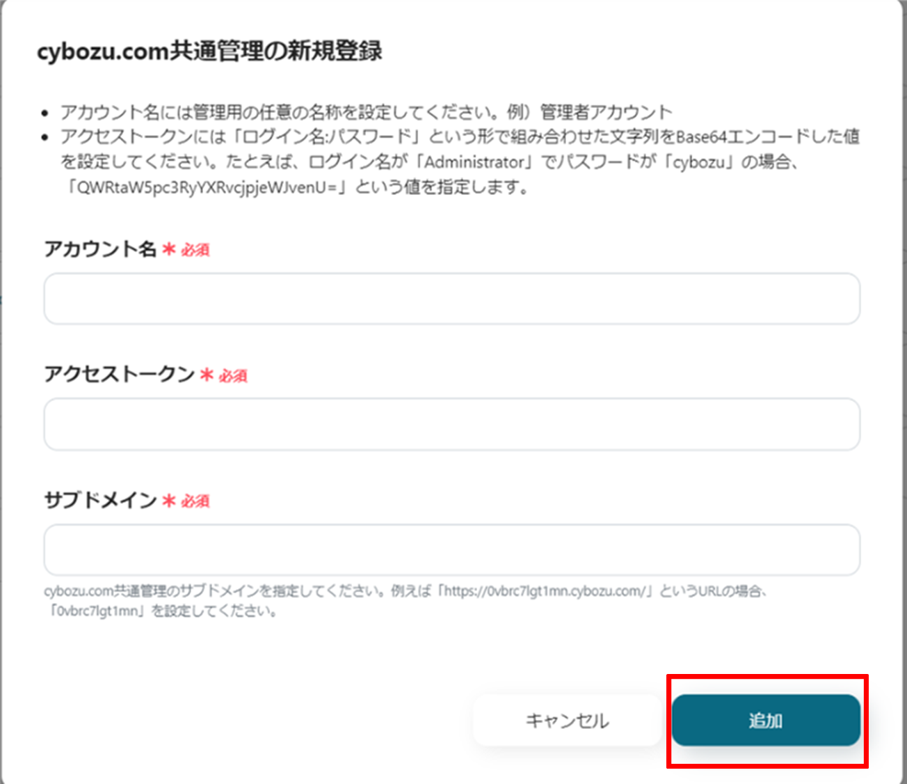 (5)cybozu.com共通管理の新規登録画面から、アカウント名、アクセストークン、サブドメインを入力し、「追加」をクリックします。