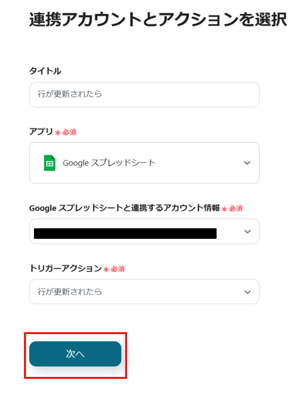 (2)Google スプレッドシートの連携アカウントとアクションを選択画面からGoogle スプレッドシートと連携するアカウント情報に誤りがないかを確認し、トリガーアクションは「行が更新されたら」のままで「次へ」をクリックします。