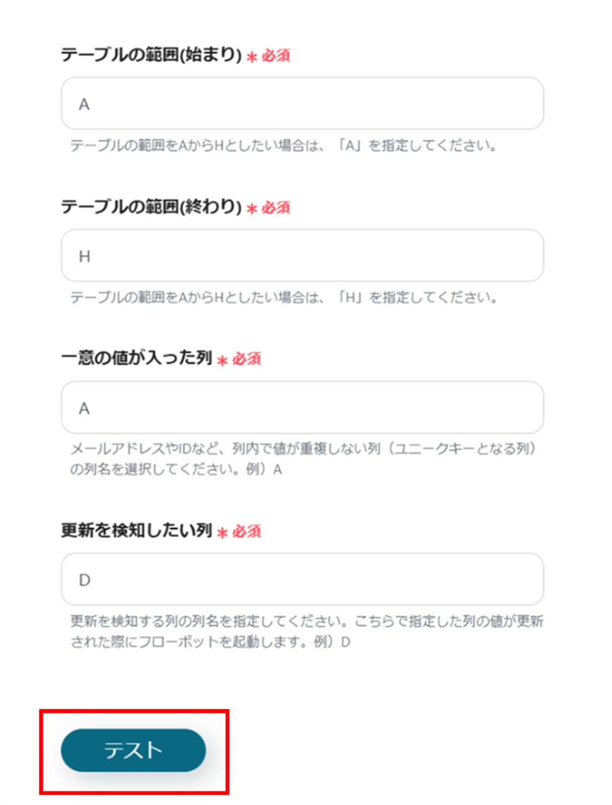 さらに下へ進み、テーブルの範囲(始まり)、テーブルの範囲(終わり)、一意の値が入った列、更新を検知したい列を入力します。