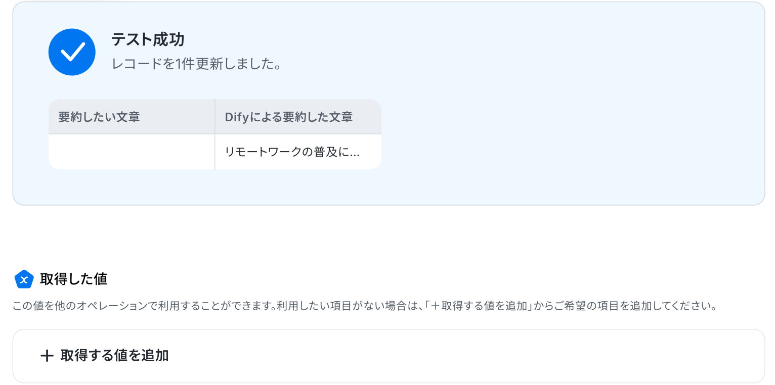 「チャットメッセージを送信」では、プロンプト内にJotformから取得した問い合わせ内容などのアウトプット(変数)を埋め込んでください。 「レコードを追加する」では、要約結果やJotformの回答情報などを各項目に引用できます。 ■注意事項