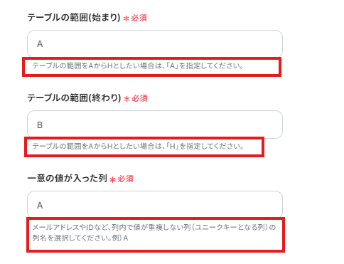 「テーブルの範囲」「一意の値が入った列」は、入力欄下の説明に従って、入力してください。