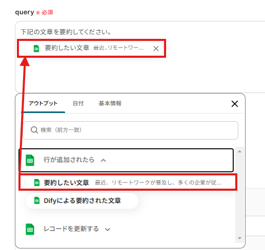 Google スプレッドシートのトリガー設定では、自動化の対象としたいスプレッドシートとシート名を任意で設定してください。 Difyに要約を依頼するオペレーションでは、どのような要約を行いたいかに合わせて、送信するプロンプト(query)の内容を任意で設定してください。