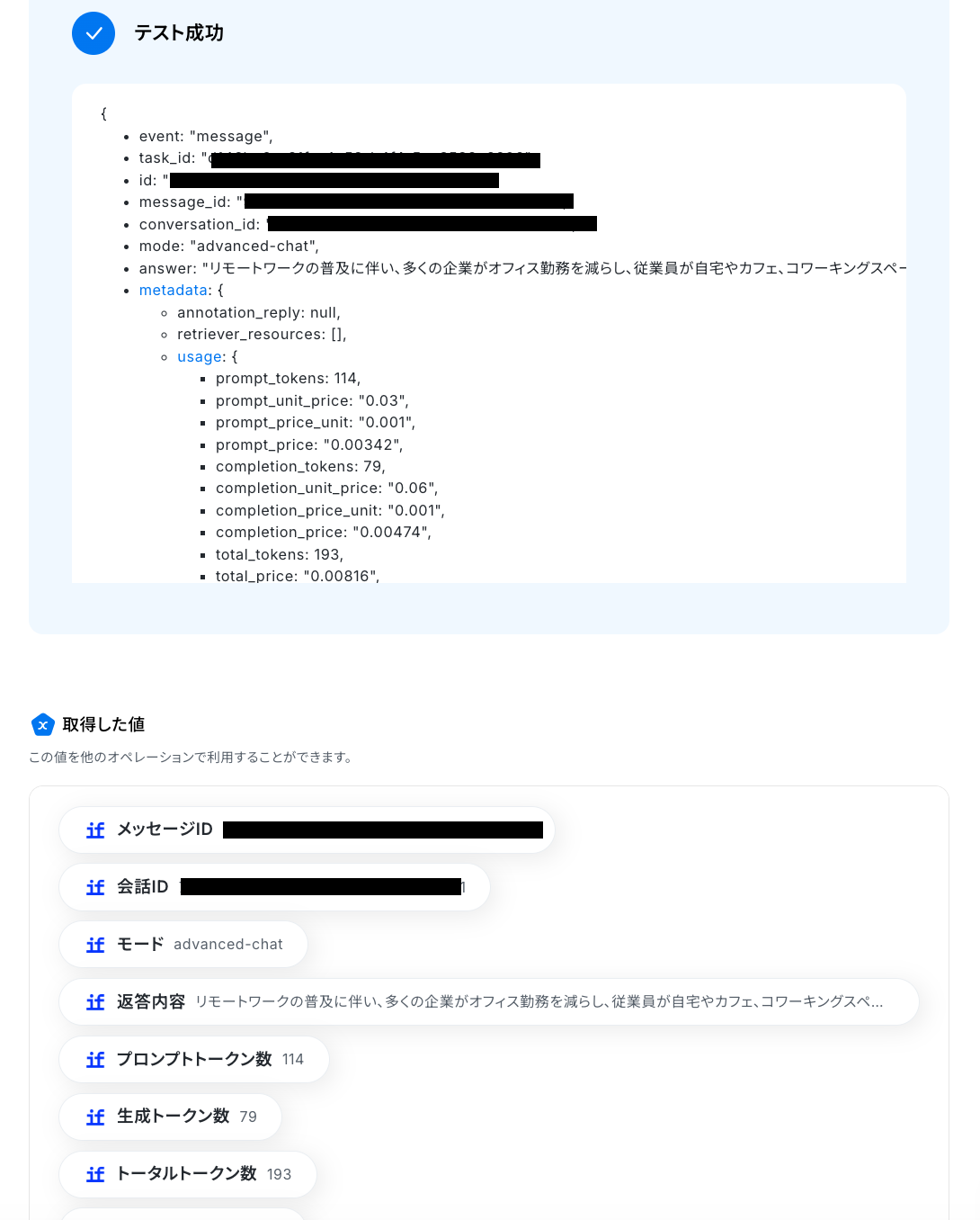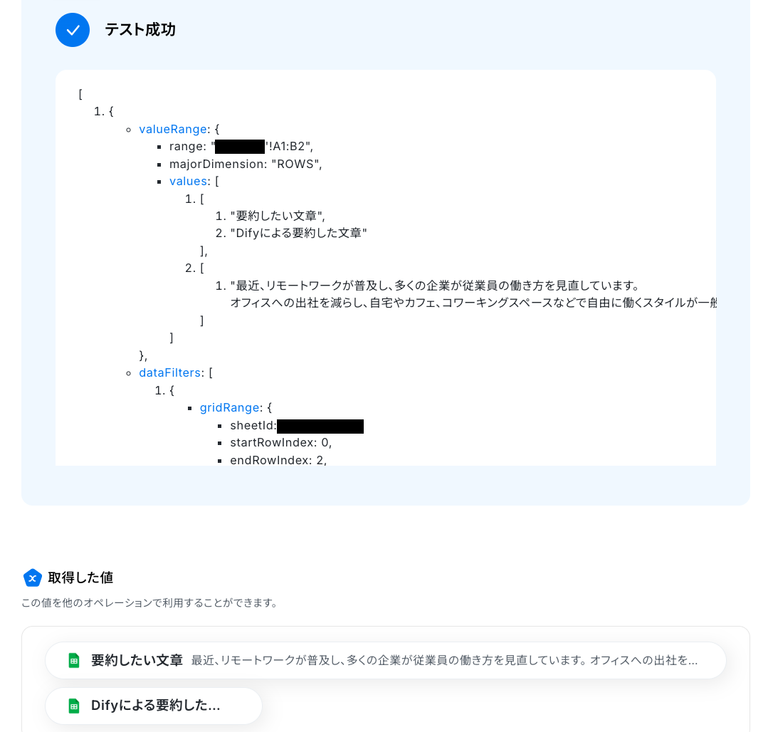 入力を終えたら、「テスト」を実行し、成功したら「保存する」をクリックします。 ※表示されているアウトプットは「この値を他のオペレーションで利用することができます。」と表記があるように、次の設定でも活用できます。
